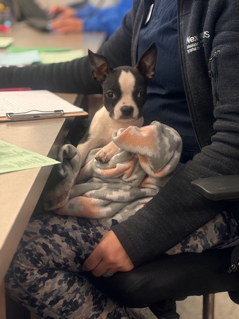 Buddy is our clinic mascot , usually occupying the front desk in a lap. He is 6 months currently so he helps us by taking naps and being our emotional support friend for the long days as well as greeting clients. Buddy belongs to Dr. Flanders and enjoys coming with dad to work almost every day – as his sibling Rosie is “not as much fun to hang with ” in his words. Buddy enjoys sleeping, eating peanut butter and cuddling in his spare time. He can be seen sleeping in his baby carrier at our front desk with his nanny Alex.